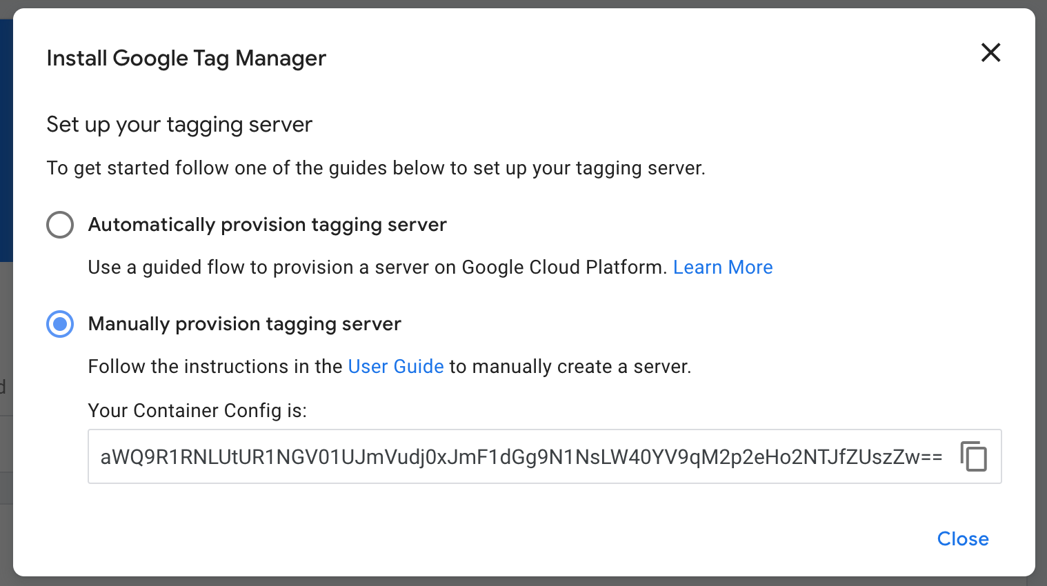 Step 4 Select the Manually provision tagging server option and copy the container config.